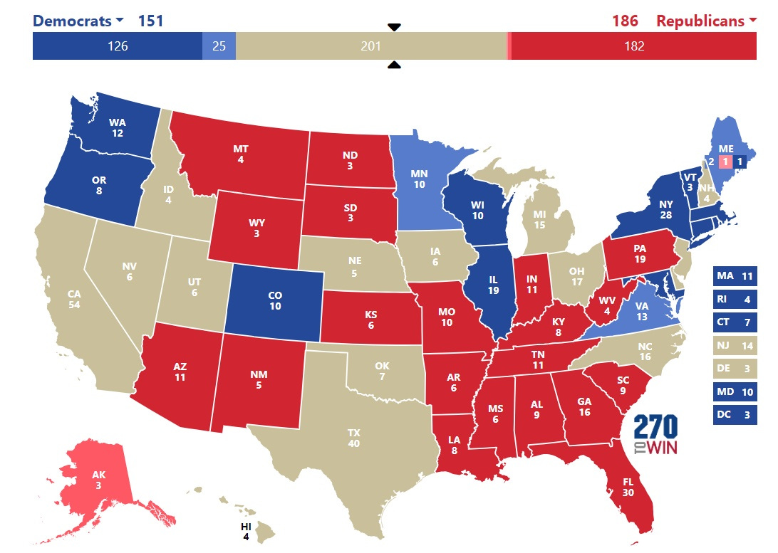 According to the 270 to Win website, from which the below map comes, those 15 states represent 201 electoral votes. A candidate needs 270 to win the election and, according to CNN’s debate criteria, 270 to get on the debate stage.