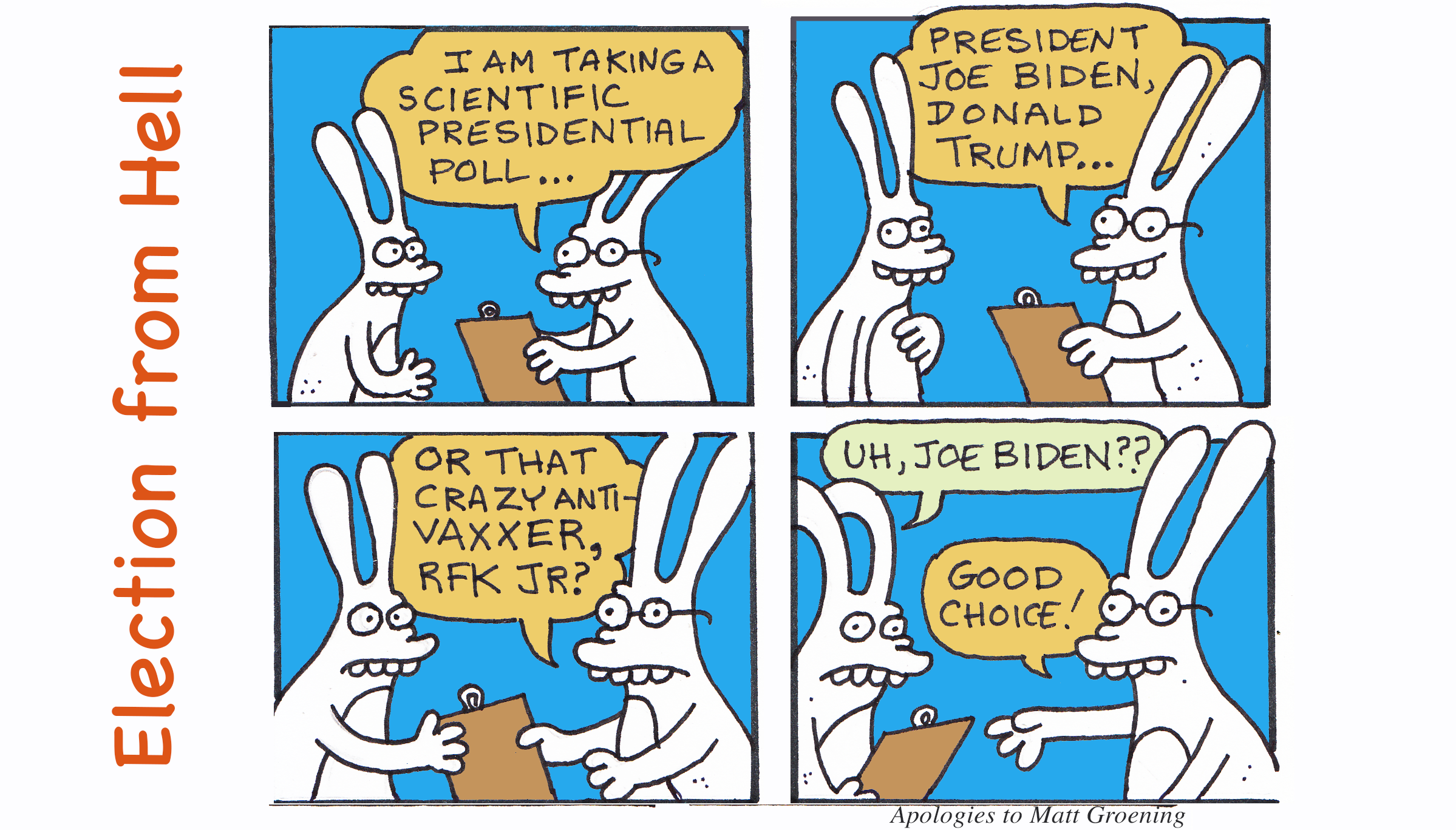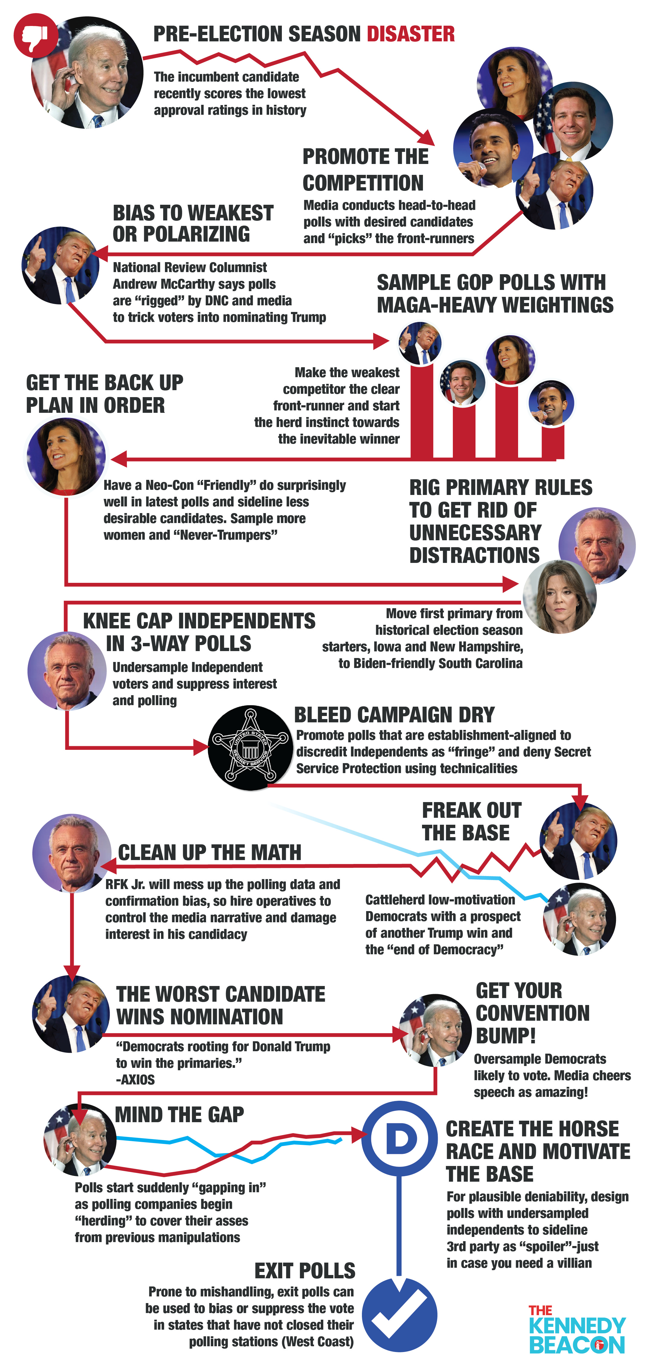 Results from a recent poll conducted by Economist/YouGov show Trump at 44%, Biden at 43% and Kennedy at 3%. For this poll, it appears that the first three options presented were: Biden, Trump, or Someone Else. Of those who chose “Someone Else,” it seems only a few volunteered the name of their preferred candidate. This is one of a number of ways in which poll results can be skewed and manipulated.