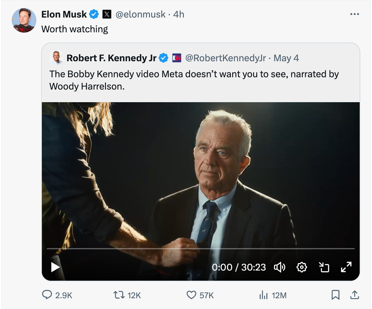 Elon Musk, CEO of SpaceX and Tesla, and owner of X (formerly Twitter), today re-tweeted presidential candidate Robert F. Kennedy Jr.’s tweet of a link to the new short film, “Who is Bobby Kennedy?”