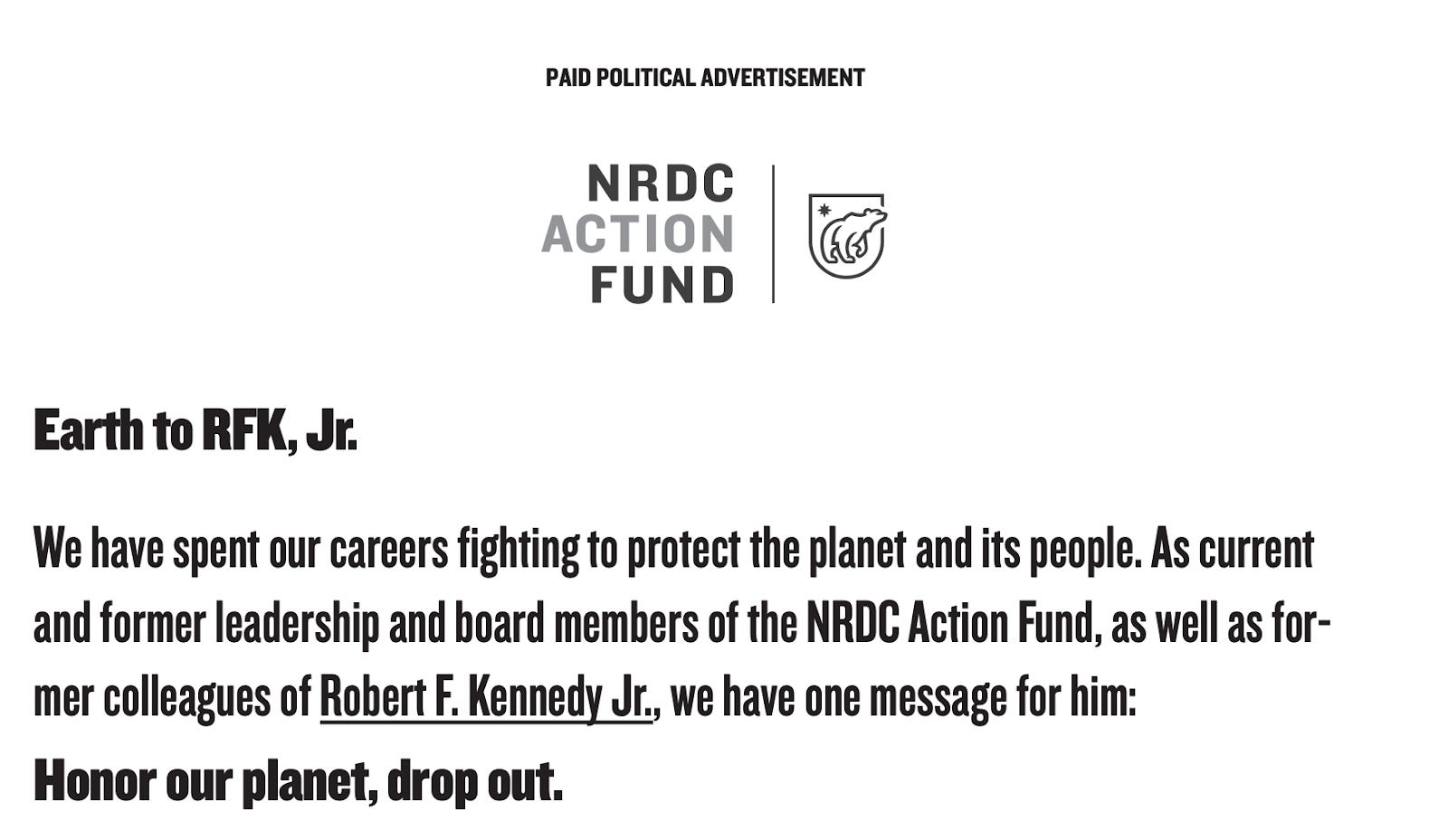 “Honor our planet, drop out,” read the letter, published as a full-page ad. The ad continued, “RFK Jr. has chosen to play the role of election spoiler to the benefit of Donald Trump – the single worst environmental president our country has ever had.”