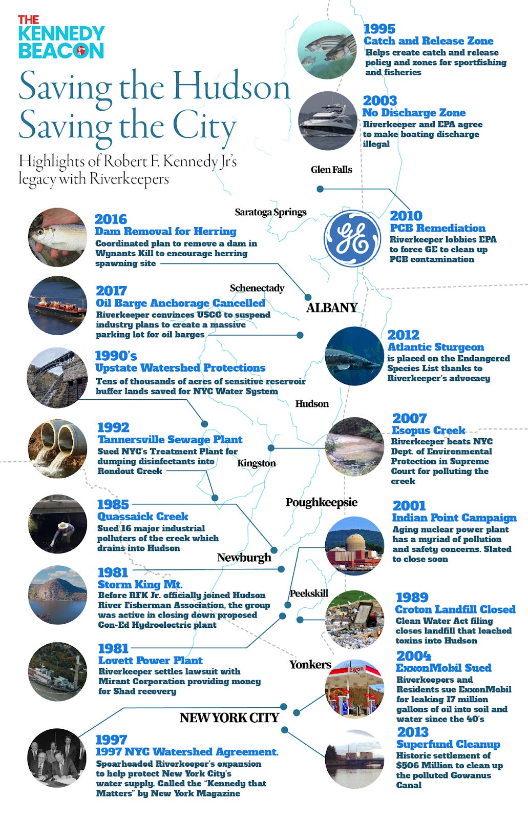 Noted in the article, almost as an after-thought, was Kennedy’s long list of accomplishments in the environmental movement, including, with Riverkeeper, helping to clean up the Hudson River, and, together with the Waterkeeper Alliance, closing a landfill polluting New York’s water supply.