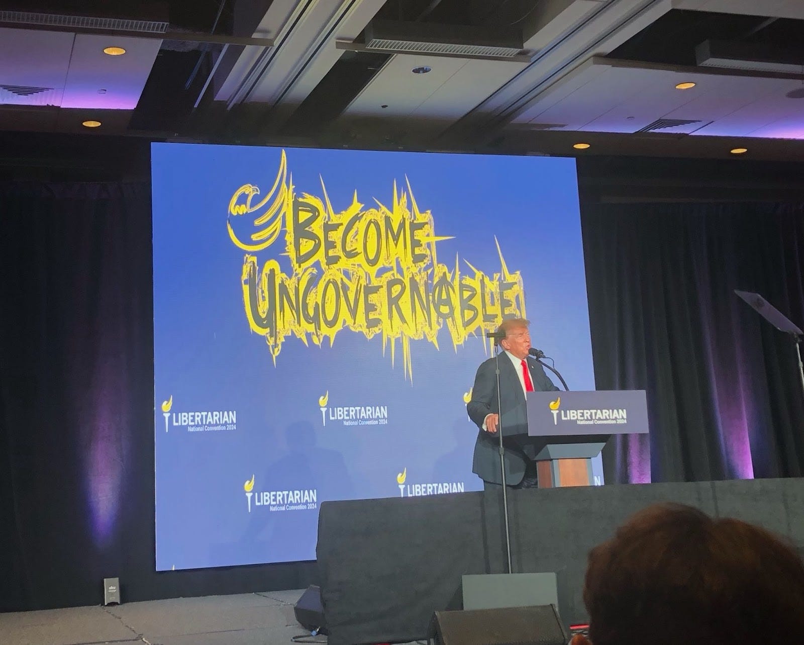 President Trump gave his own speech on Saturday to an extremely raucous, even hostile crowd. Whereas Kennedy had his Kennedy/Shanahan logo behind him, on the screen behind Trump was a Libertarian motto, “Become Ungovernable.” When Trump took the stage, he was greeted by jeers, with some people chanting, “Hyp-o-crite!”
