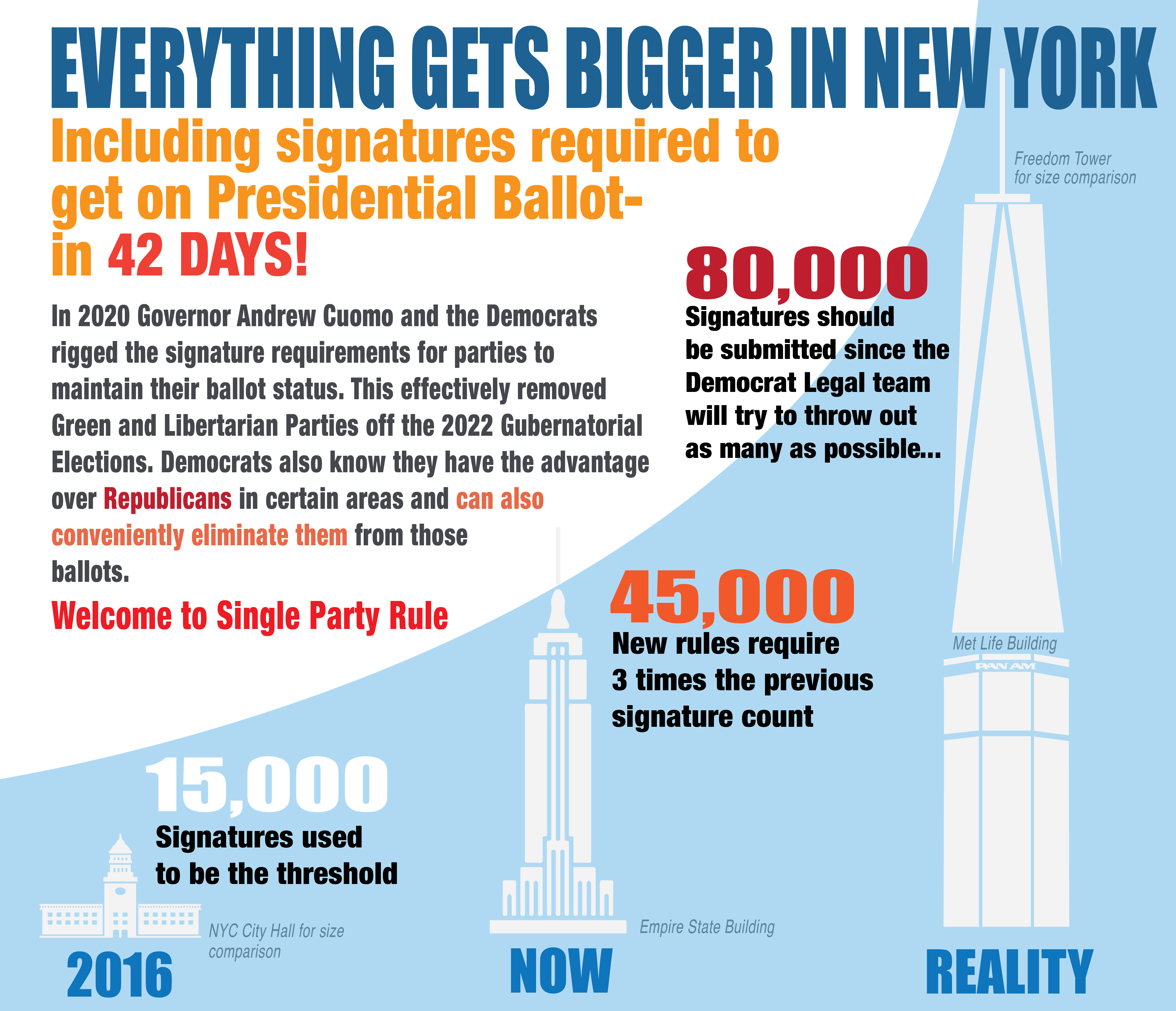 In 2020, during the COVID-19 lockdown, then-governor Andrew Cuomo slipped new rules into the emergency COVID budget that tripled the number of signatures independent candidates have to file in order to qualify for the ballot. Previously, only 15,000 valid signatures were required for independent presidential and gubernatorial candidates to obtain ballot access, but in 2020, this number jumped to 45,000 signatures. The new rule also requires existing third parties to receive 2% of the vote in presidential elections to retain the ballot line.