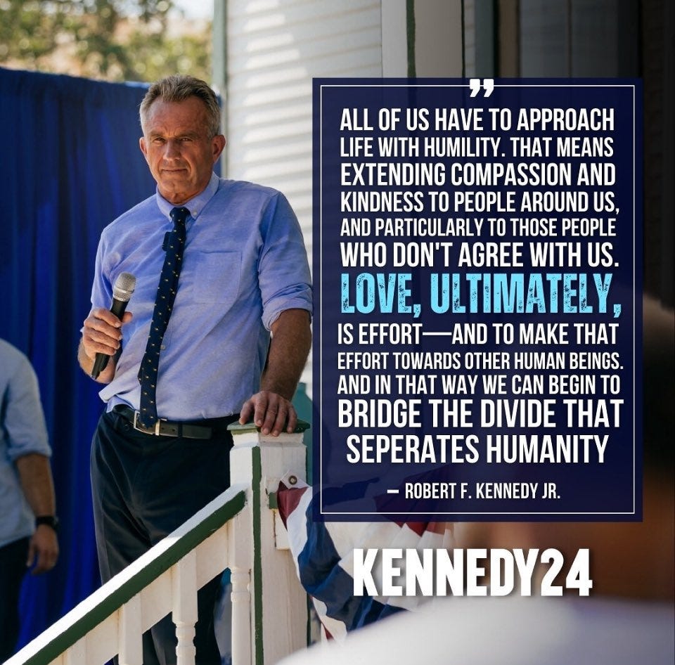 “To change the divisive nature of American politics, I’m running a civil, independent campaign focused on issues not easily identified as right or left. As President, I will pursue sensible policies that are good for ALL Americans.” – RFK Jr.