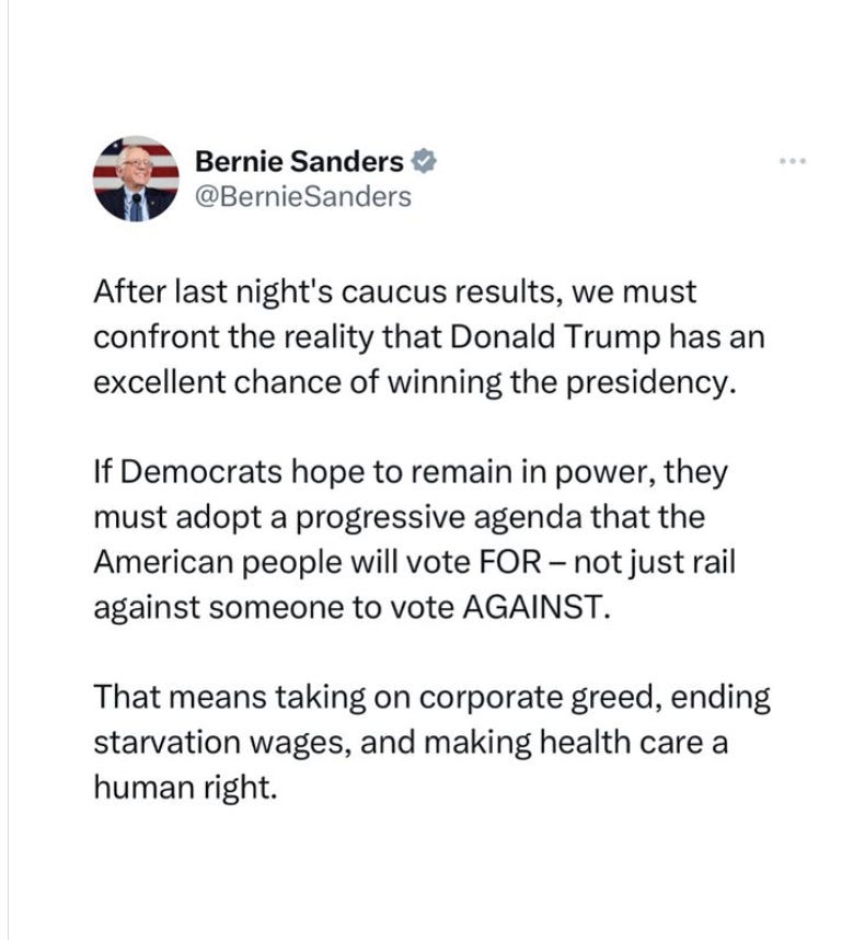 Kennedy’s appeal for progressives – Senator Bernie Sanders’s recent Instagram post about Trumps win in the Iowa Caucuses points to the same issues that RFK Jr. is campaigning on: